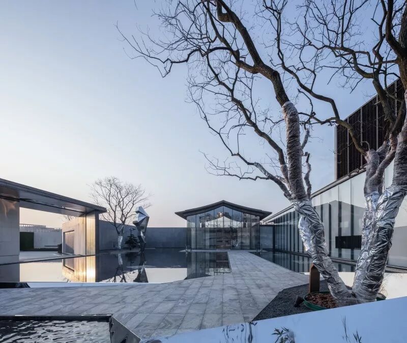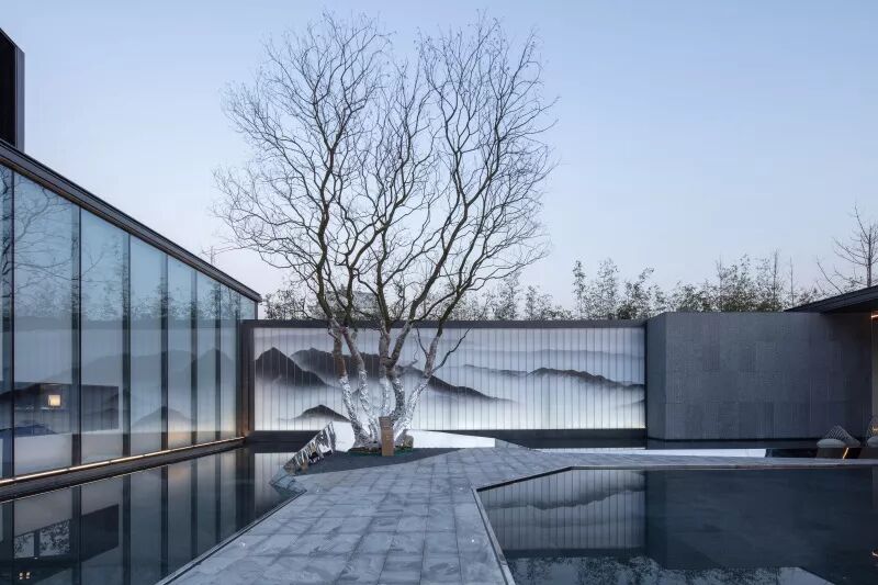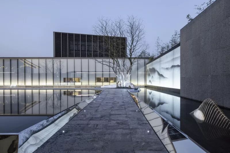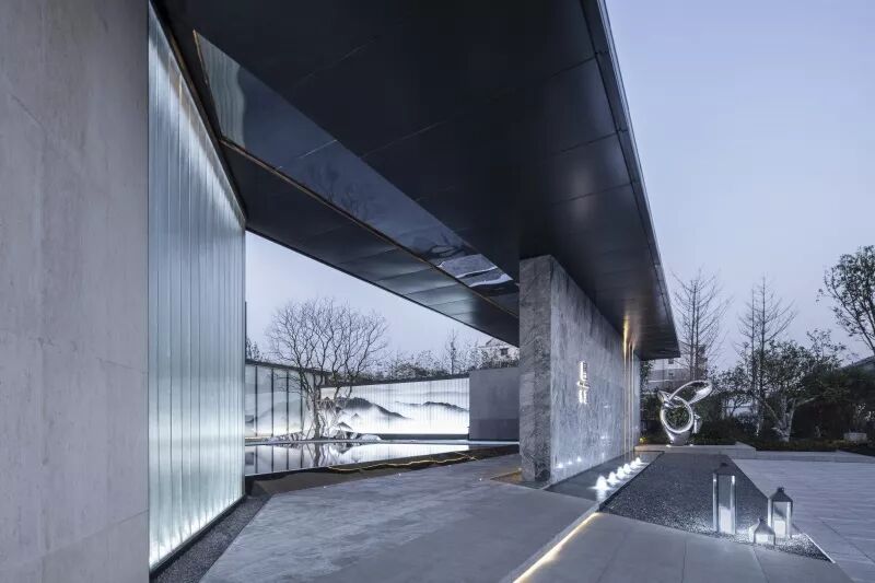 景观门楼既是入口,也是前场的景观连廊。步入连廊,一面内置水乡特色山水绢画的U玻景墙展现在人们面前,水墨韵味满盈。