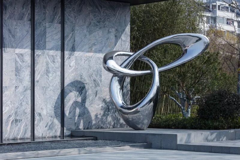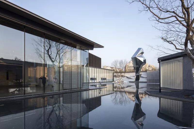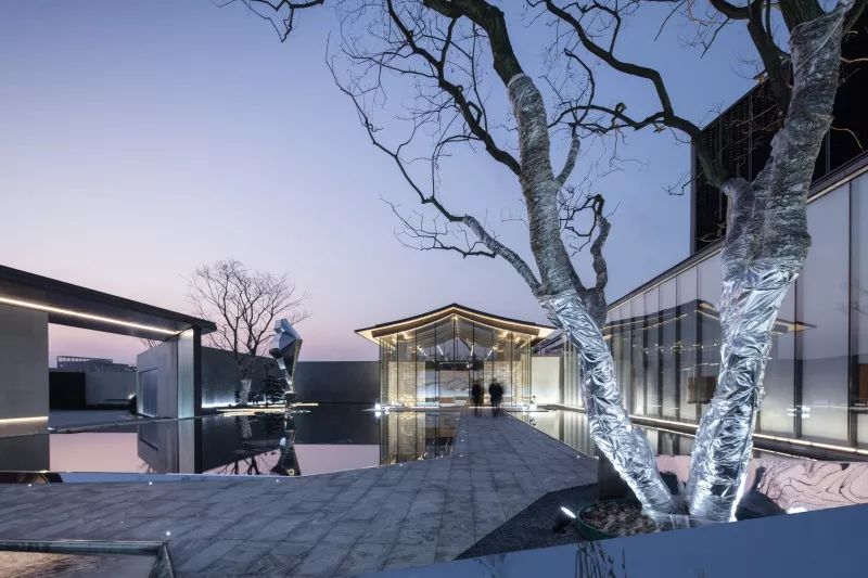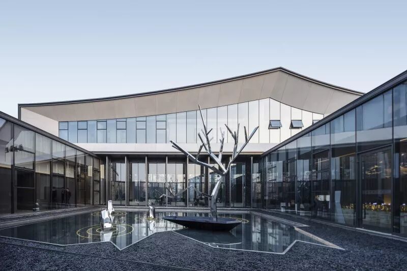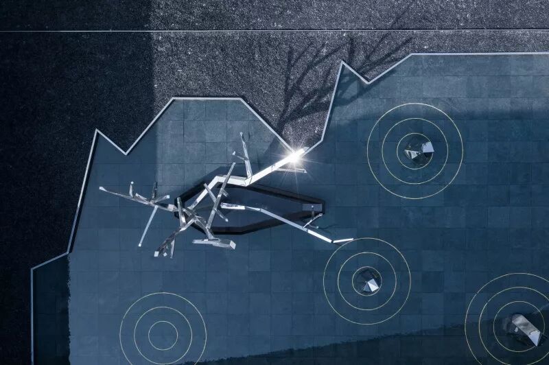 镜面水景倒映着建筑的倩影,水面与建筑融为一体。人们踱步经过,从水景侧边的镜面不锈钢中,不断看见自己的身影,趣味十足。黑色的池底,仿若一方墨池,呼应绍兴后马八景之一的“趣园墨池”。景观雕塑仿照绍兴柯岩云骨之形,静于水面,正气凛然。