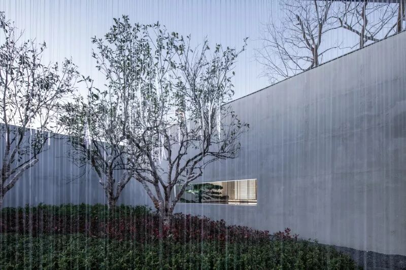该项目示范区位于项目东南角,偏离主干道,距离稽山路与双周路路口较远,缺少昭示性,我们在十字路口设置精神堡垒。双周路往示范区通行道路市政界面较乱,且有垃圾处理站,因此设计团队采用合院空间,并且设计7.5米高的大型玻璃构筑,提升景观视线效果,大气而富有现代感,客户行驶至双周路,即可看见示范区构筑。围合的合院空间可以相对遮蔽北侧垃圾处理站的不利因素。景墙前后各有一排景观树阵,增强入口的仪式感。