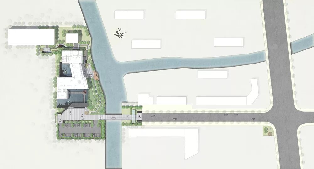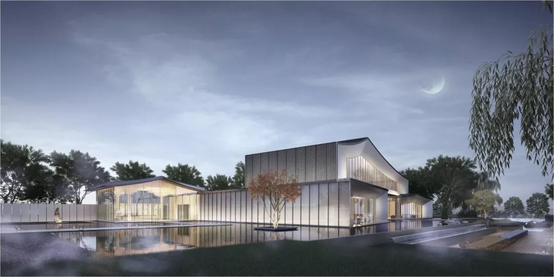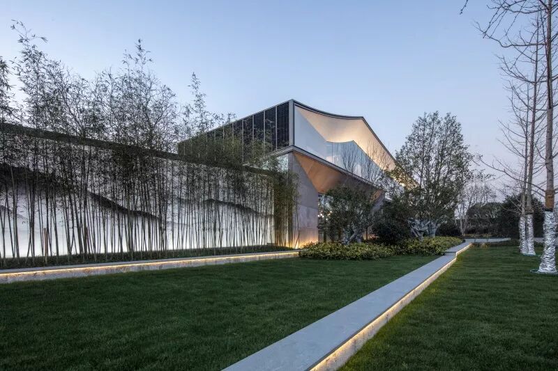 示范区后场面对水质良好的西周直江,设计团队打造了滨河景观带。沿建筑玻璃立面处设计的平台空间可用作室外洽谈区。景观设计采用现代市政手法,树阵广场结合草坪,局部种植花卉。人们于沿河外挑木平台上休憩,可观看沿河风光。草坪、花田、滨河景观打造出“花梗渔唱”之景。