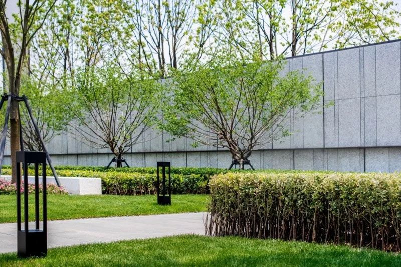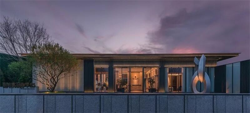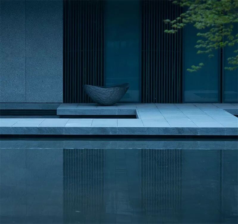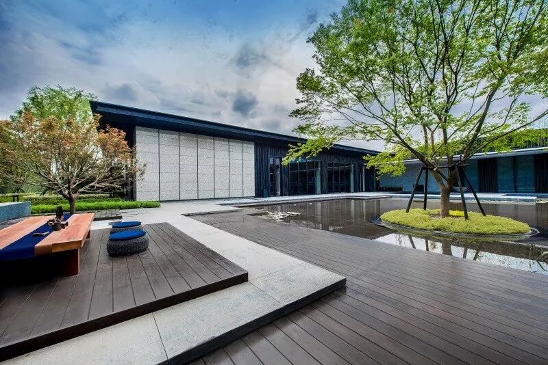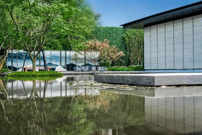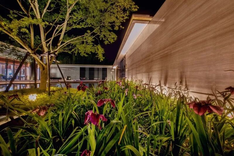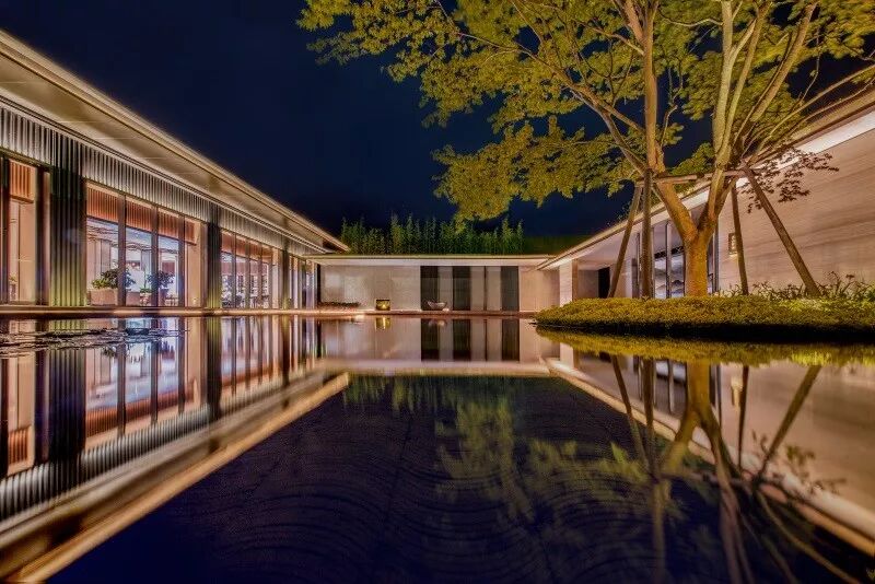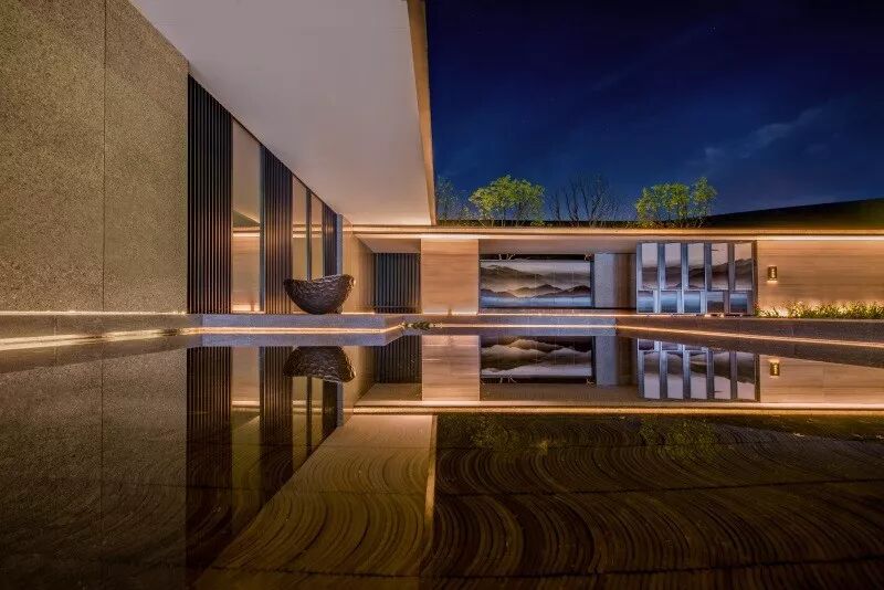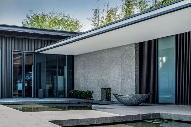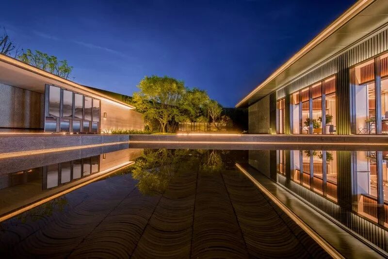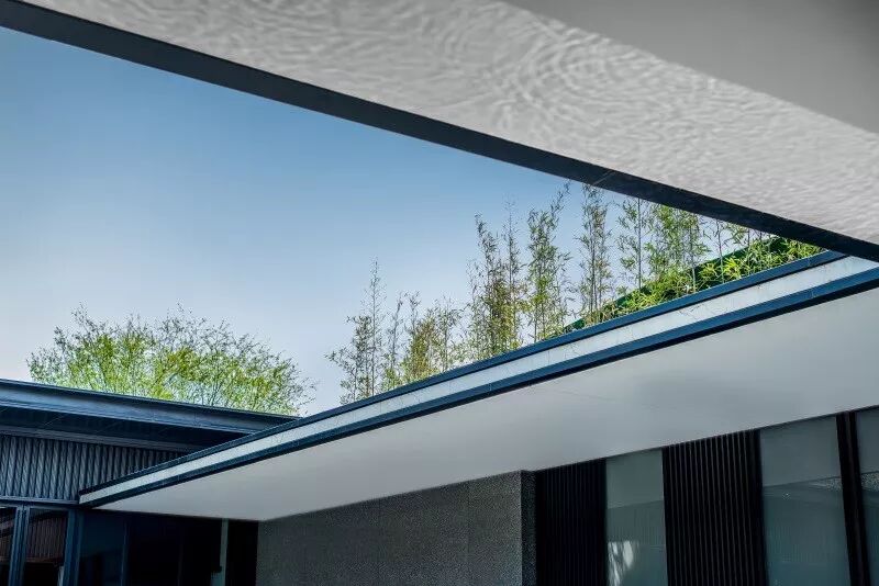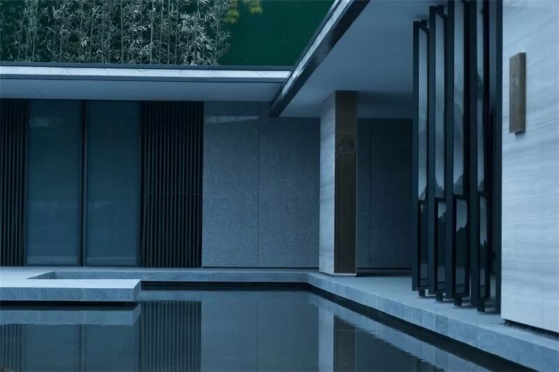 半围合式的连廊,界定了整个场地的界限。竖向的尺度将空间的线性感完美体现,立面的墙体通过有序的分割将光与影带入,产生延续感。格栅的疏密排列,形成了一个个不同角度的取景框,在这些取景框中,去发现最美的那幅风景。水墨晕染般的地面石材与立面的素色墙面相互融合。树荫下,读诗品茗,对话谈心,在开阖有序的空间里,聆听光、水声、风声、树语诉说着的生活意境。